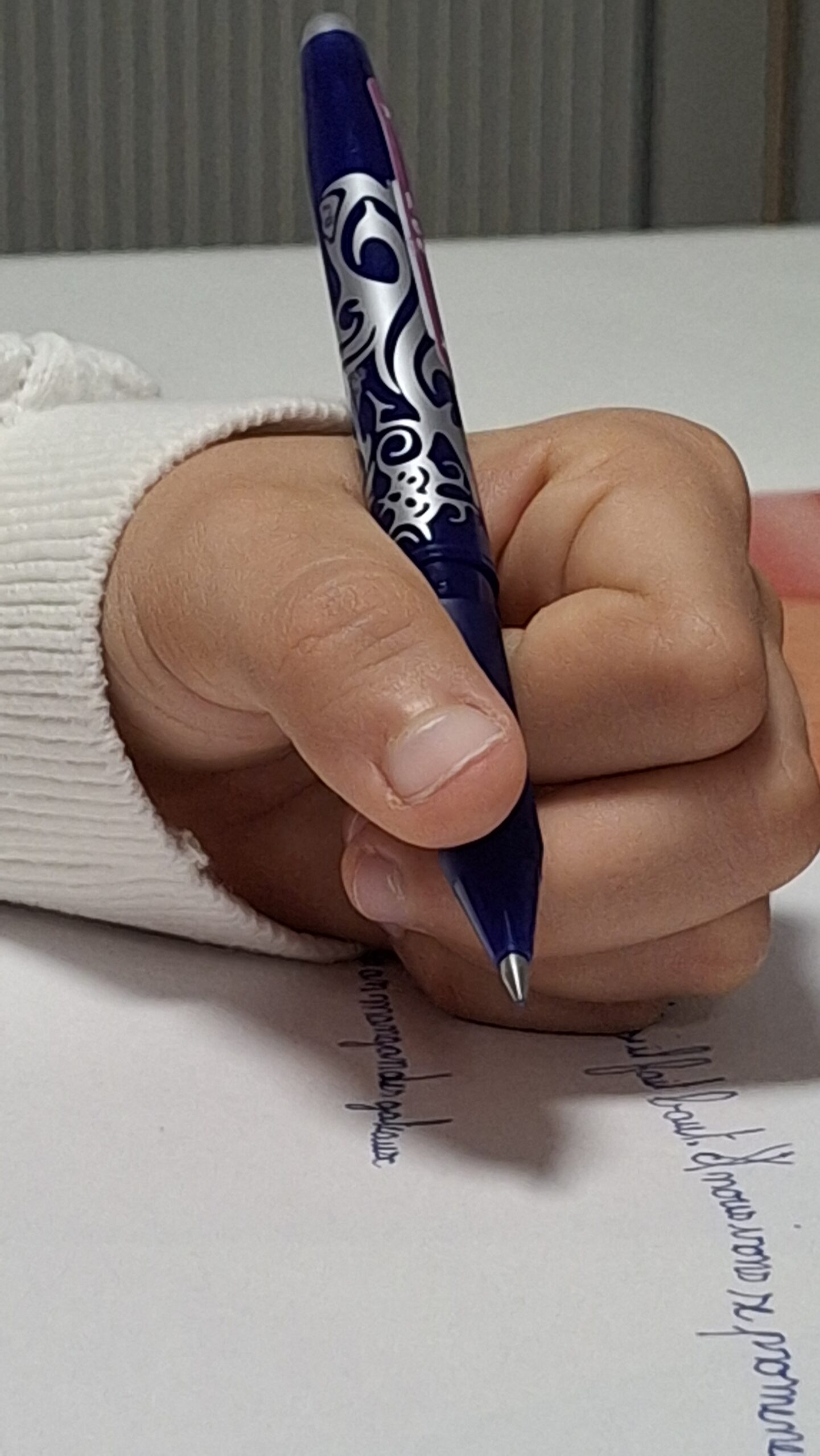 Z. gauchère au CE2 tenait mal son stylo. Son pouce empêchait son index de bouger correctement. Après 8 séances, les doigts sont bien positionnés. Il reste le poignet à redresser et l’index à assouplir.