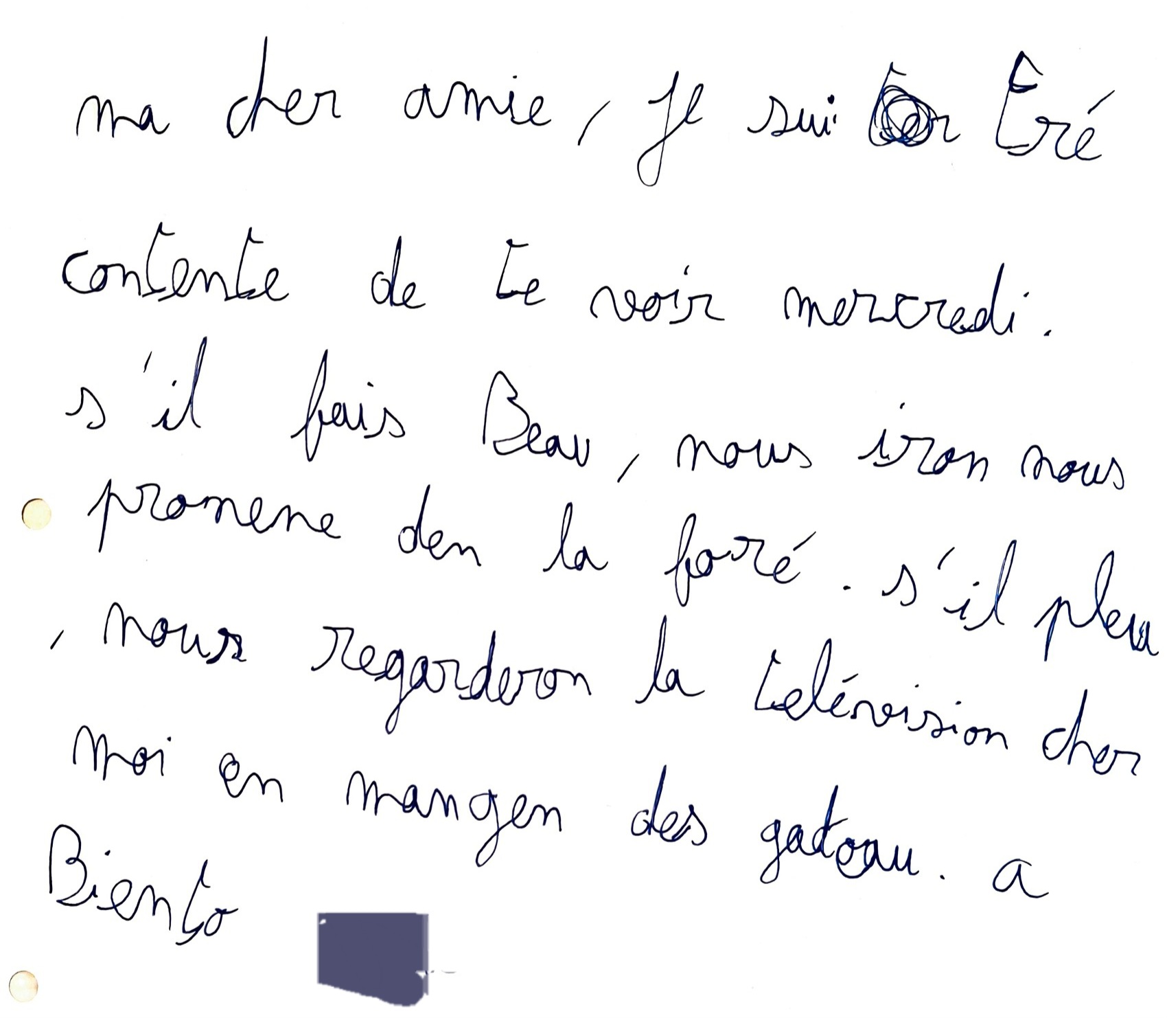 E. garçon gaucher, est venu consulter en début de CE1 suite à des douleurs à la main et au poignet, une illisibilité ainsi qu’une lenteur d’écriture. Voici son écriture lors du bilan et à la fin de sa rééducation. Que de progrès ! Bravo champion !