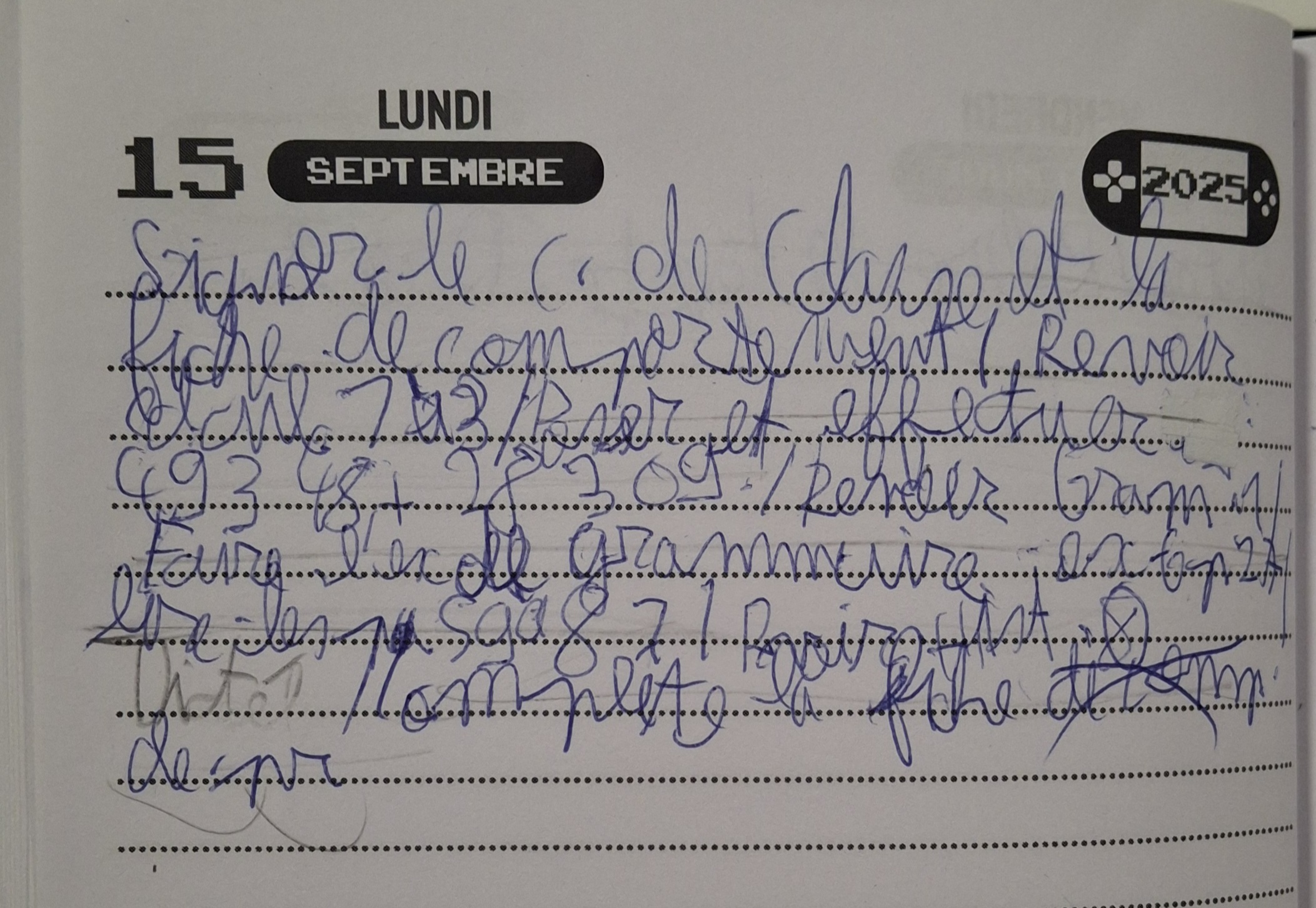 L. droitier en CM2 est venu consulter suite une illisibilité, un manque de fluidité et une lenteur d’écriture. Voici son écriture dans son agenda lors du bilan puis lors des exercices de la 8e séance.